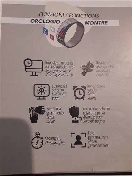 Cassa metallo - Schermo LCD - Fondello plastica con sensori - Caratteristiche connessione bluetooth, ricaricabile tramite USB - Batteria durata in standby 15 giorni - Cinturino silicone - Water Resistant IP67 - Compatibilità Android 4.4 / Apple IOS 8.4 o superiori - Funzioni smartwatch: menu' a scorrimento, sfondo personalizzabile, cronografo, accensione schermo tramite rotazione polso, controllo luminosità schermo, foto personalizzate, timer, allarme, touch screen e pulsanti resistenti all'acqua. - Funzioni benessere: monitoraggio della qualità del sonno, livelli di ossigeno(02) nel sangue, elettro-cardiogramma (ECG), frequenza cardiaca e pressione sanguigna - Funzioni sport: promemoria per l'idratazione, calcolo consumo calorie, promemoria , contapassi distanza, tracciamento del percorso, meteo, luce led, battiti per minuto e tempo (BPM/CAL/TEMPO) Sport compatibili: Camminata, Corsa, Alpinismo, Bici, Nuoto, Basket, Ping-Pong e Badminton - Funzioni smartphone: trova orologio, notifica messaggi e chiamate, anti smarrimento cellulare, controllo remoto camera e musica.