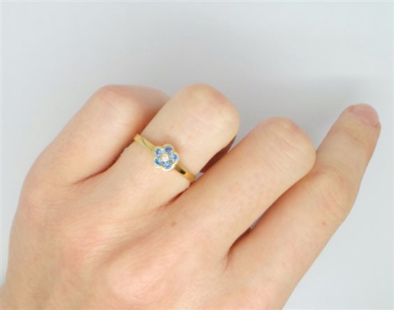 <p>ANELLO IN ORO GIALLO LUCIDO DI MM 1.9 CON FIORELLINO CENTRALE IMPREZIOSITO DA ZIRCONI BLU DIAMETRO MM 6 . MISURA DITO 11.MARCHIO E LOGO NELL' INTERNO DEL GAMBO. TUTTO CON CERTIFICATO DI GARANZIA</p>