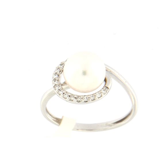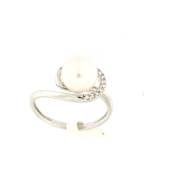 anello in oro bianco lucido arrotondato con perla di acqua dolce centrale sferica e intera di colore bianco senza nessun segno diametro mm 8,5 . attorno alla perla sono incastonati dei zirconi . certificato di garanzia
