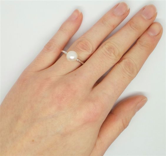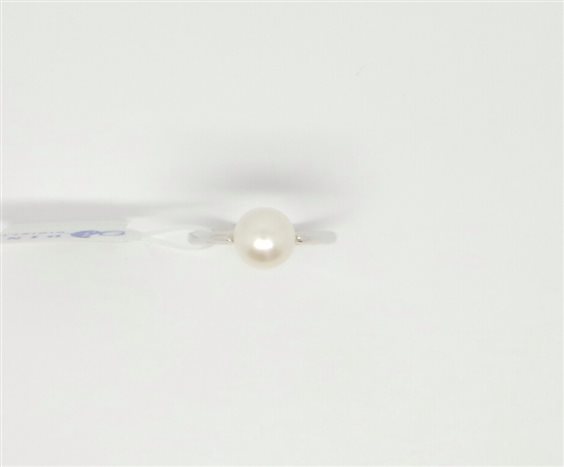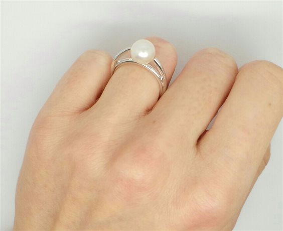 anello in oro bianco con gambo arrotondato comfort il quale va a sdoppiarsi nella parte superiore reggendo perla japponese qualita' akoya bianca di mm 8.2 . altezza totale misura mm 28.2. misura dito 15. tutto con certificato di garanzia.