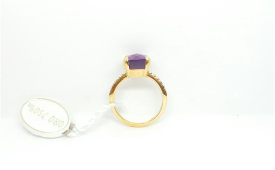 ANELLO TUTTO ORO GIALLO LUCIDO CON PIETRA CENTRALE IN AMETISTA SFACCETTATA DI MISURA MM 10 X 10. GAMBO UNIFORME DI MM 1.9 CON INCASSATI LATERALMENTE 5 ZIRCONI PER LATO.