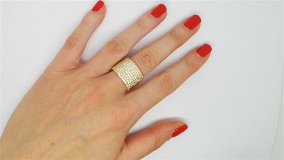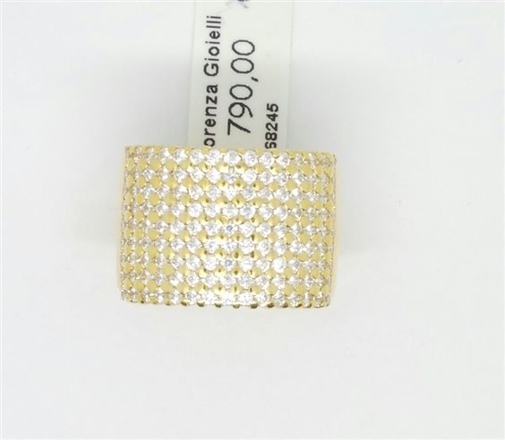 anello a fascia in oro giallo lucido tempestato di zirconi con larghezza mm 15, gambo sotto mm 8.2 misura dito 16