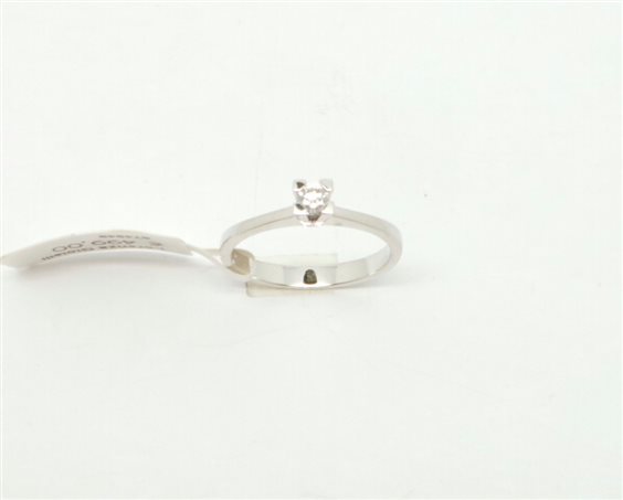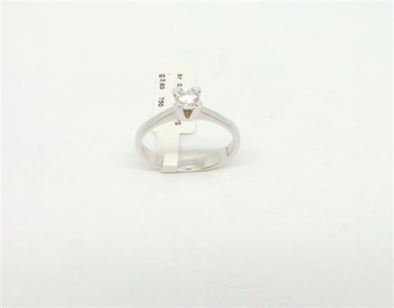 solitario in oro bianco con gambo robusto di mm 3 e diamante in taglio brillante incastonate a quattro punte kt 0.30 colore g purezza vs misure della pietra incastonata mm 5.2 zx 5.2 altezza mm 6.2 ,misura dito 18. possibilita' di piccola incisione nell' interno del gambo. tutto con certificato di garanzia e punzone secondo normative inciso all'interno.