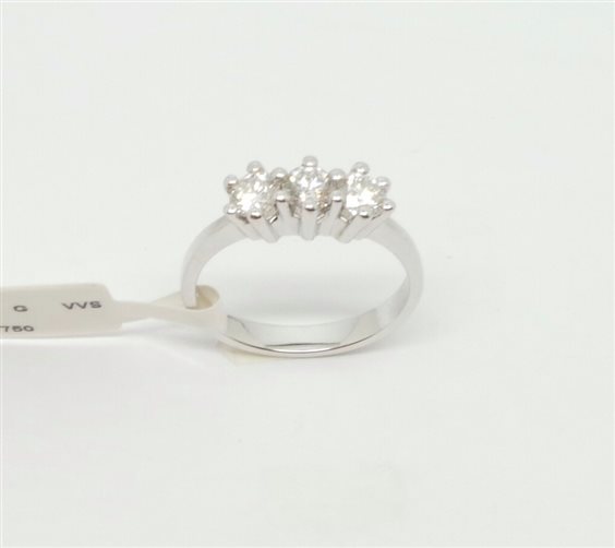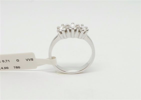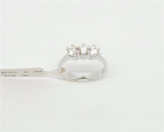 anello trilogy con tre diamanti in taglio brillante per kt tot 0.71 incastonato a sei punte ,misura dell' incastonatura mm 13 x 5.5 altezza mm 6 . gambo robusto misura dito 15 ,possibilita' di essere messo a misura stringendolo di tre misure o allargarlo di altre tre . tutto con certificato di garanzia .
