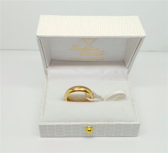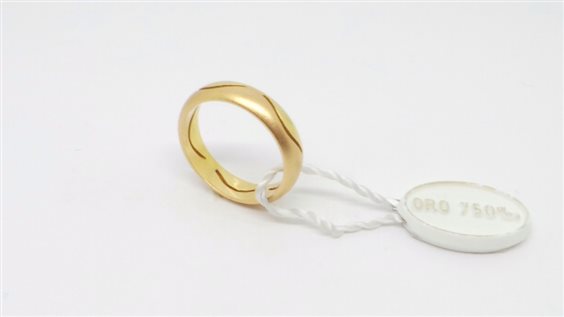 FEDE NUNZIALE PER META' ORO GIALLO LUCIDO E PER META' ORO ROSE' SATINATO DIVISA DA FESSURA A FORMA DI ONDA PRODOTTA ARTIGIANALMENTE. LARGHEZZA MM 5.3, SPESSORE MM 2, CON POSSIBILITA' DI REALIZZARLA IN QUALSIASI COMBINAZIONE DEL COLORE DELL'ORO. PUNZONE SECONDO NORMATIVE INCISO ALL'INTERNO. INCISIONE OMAGGIO. TUTTO CON CERTIFICATO DI GARANZIA