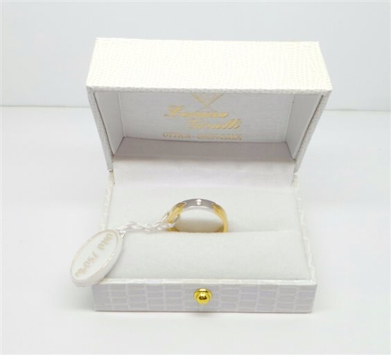 FEDE NUNZIALE IN ORO GIALLO LUCIDO ARTIGIANALE A FORMA LEGGERMENTE SQUADRATA DI LARGHEZZA MM 3.8 SPESSORE MM 1.7 CON AL CENTRO INSERTO IN ORO BIANCO LUCIDO CON INCASTONATI UN DIAMNTININO A FILO FEDE .CERTIFICATO DI GARANZIA E PUNZONE INCISO SECONDO NORMATIVE.INCISIONE OMAGGIO .POSSIBILITA' DI REALIZZAZIONE ANCHE IN ORO ROSE' E DI QUALSIASI MISURA IN 25 GIORNI . TUTTO CON CERTIFICATO DI GARANZIA
