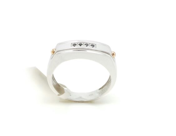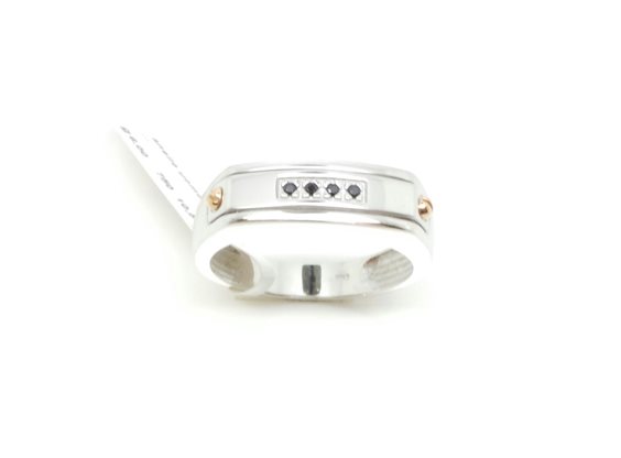 anello a forma di fascetta leggermente in scalare in oro bianco e riporti in oro rosso ,nella parte centrale sono incastonati dei spinelli neri .larghezza anello parte centrale mm 6.5 parte del gambo sotto mm 4.8. misura dito 25. possibilita' di essere portato a misura . certificato di garanzia.