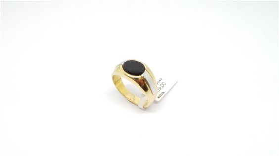Anello classico da uomo con parte sopra a forma ovale impreziosita da onice misura mm 12 x 11 .Il gambo tutto oro lucido con inserti laterali in oro bianco in scalare nella parte inferiore più sottile misura 5 mm. Elegante anello da uomo, leggero e di facile indosso, perfetto come idea regalo per lui, realizzato in Italia.
