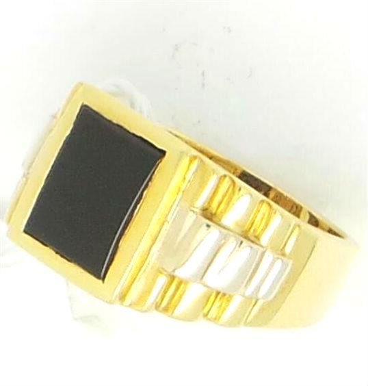 ANELLO IN ORO GIALLO 750/°°°LUCIDO E MASSICCIO DA UOMO CON PARTE CENTRALE RETTANGOLARE CON INCASSATA PIETRA ONICE NERA LUCIDA DI MM 12 X GAMBO LEGGERMENTE IN SCALARE CON LAVORAZIONE LATERALE IN ORO BIANCO CON MISURA SOTTO AL DITO DI MM 4.8 . MISURA DITO 19. PESO TOTALE GR 12
