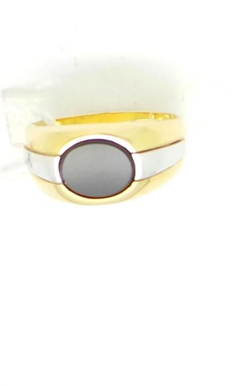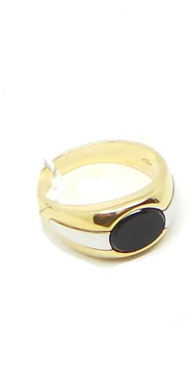 anello a fascetta in oro giallo lucido 750/°°° da uomo con pietra centrale ovale in onice liscia ,con inserto laterale in oro bianco, massiccio . misura parte centrale mm 11 in scalare sotto il gambo misura larghezza mm 4.6 peso tot gr 12.3. misura dito 23