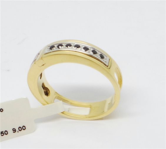 anello uomo in oro giallo a forma di fascetta uniforme di mm 6 , impreziosito da zirconi neri su inserti in oro bianco satinato , sotto il gambo puo' essere portato a misura . tutto con certificato di garanzia.
