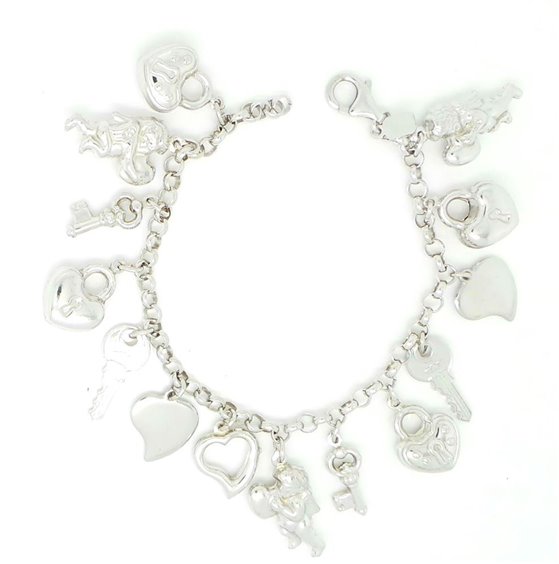 BRACCALE D'ARGENTO LUCIDO CON CATENA ROLLO', LUNGHEZZA 18,5 CM, CON 14 CHARMS ROMANTICI TRA CUI CHIAVE DELL' AMORE, CUPIDO , LUCCHETTO E CUORICINI.PESO 22 GR