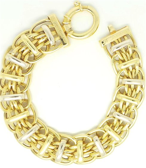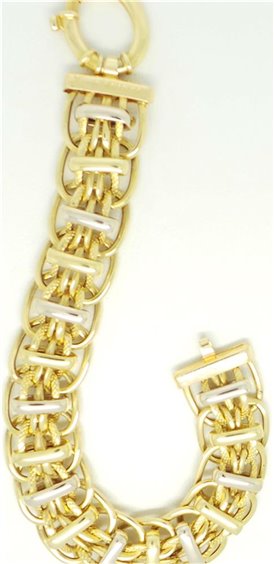 BRACCIALE DONNA IN ORO 750/°°° GIALLO MAGLIA GODRONATA LUCIDA E SATINATA CON ELEMENTI TRASVERSALI DI COLORE BIANCO ALTERNATI AI GIALLI, LARGHEZZA MAGLIE 16 MM, LUNGHEZZA TOTALE 20,5 CM, SPESSORE MASSIMO DELLE MAGLIE 7 MM, PESO GRAMMI 18,70, IMPORTANTE CHIUSURA A MOSCHETTONE