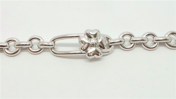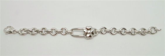 BRACCIALE IN ARGENTO LUCIDO LAVORATO CON MAGLIA ROLO ED ELEMENTO CENTRALE CON SALDATO sopra UN PORTAFORTUNA ( QUADRIFOGLIO) , larghezza delle lavorazione mm 11.4. Chiusura con moschettone.