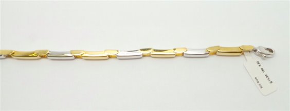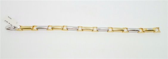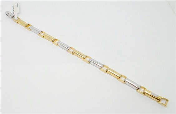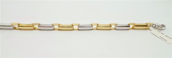 bracciale in oro giallo lucido e bianco a segmenti snodati tra loro larghezza mm 6.5 nella parte sotto i segmenti sono chiusi con lastra .chiusura con bellissimo moschettone , l'ultimo elemento riporta logo e punzone secondo normative. tutto con certificato.