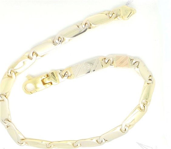bracciale oro giallo 750% con maglie massiccie in fantasia gr 17,5 .larghezza degli elementi mm 5 lunghezza tot 21 cm. elemento dove riporta il marchio di fabbrica è di oro rosso. tutto con certificato di garanzia