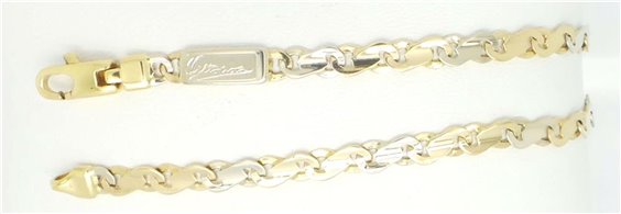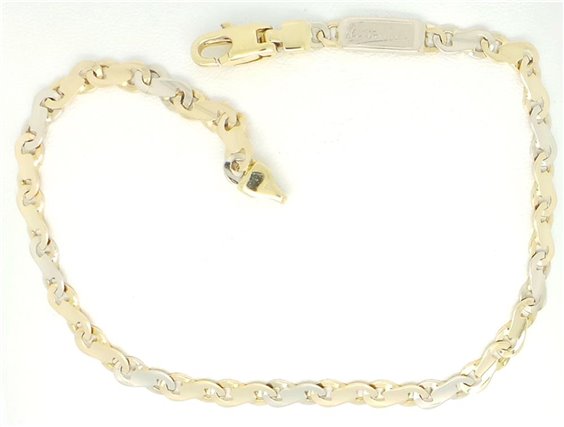 bracciale in oro giallo e bianco 750% pieno con maglie in fantasia a forma di otto peso gr 14,3 .larghezza mm 5 lunghezza tot 22cm