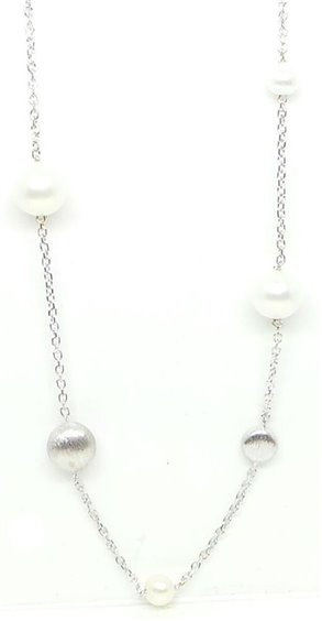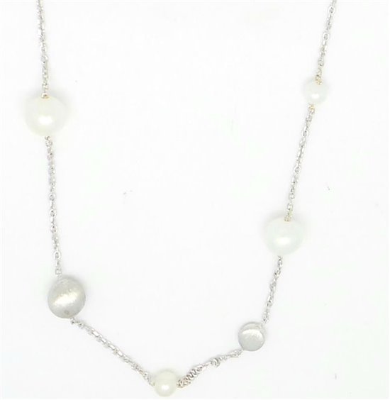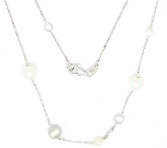 COLLANA IN ORO BIANCO 750/°°° A GIROCOLLO CON LAVORAZIONE ROLO ED ANELLINO PER ACCORCIARLA DI CM 45 . FANTASIA DI VARIE MISURE DI PERLE COLTIVATE DI FIUME E SFERETTE DI ORO SATINATO . LA PERLA PIU' GRANDE HA UN DIAMETRO DI MM 6,5 , LA PIU' PICCOLA 4 MM . PESO TOT 3.9 GR