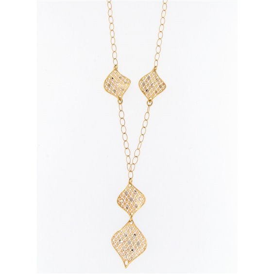 collana in oro giallo con elementi a forma di fogliolina con piccole applicazioni in oro bianco misura della catena cm 45 piu ' la parte pendente misura cm 4,5. chiusura con moschettone. certificato di garanzia