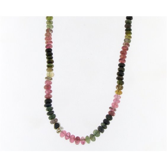 collana in pietre dure tormalina tagliate a forma ellittica di colore che va dal verde scuro ,all'ambra ,al rosa ,al verde chiaro . chiusura con molla aprente in oro 18 kt. certificato di garanzia