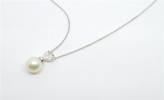 catenina oro bianco lavorazione forzatina diamantata con perla centrale di acqua dolce di diametro mm 9,5 nella parte sopra la perla cuore pave di zirconi misura mm 7 x 7 .chiusura con molla aprente. certificato di garanzia e punzonatura