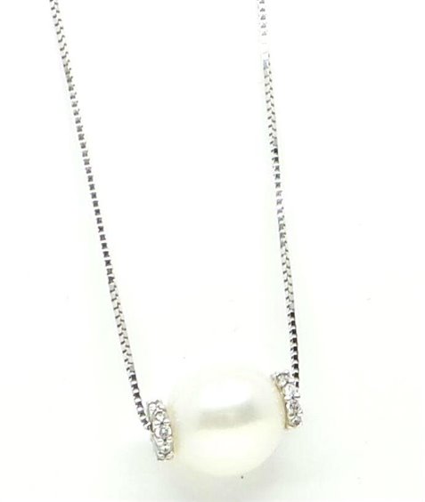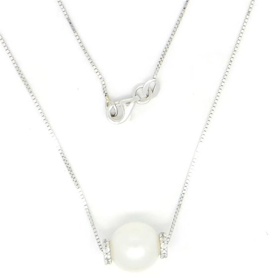COLLANA IN ORO BIANCO 750/°°° CON LAVORAZIONE VENEZIANA DI CM 42 CON PERLA COLTIVATA DI FIUME DI MM 10 PASSANTE , NELLE ESTREMITA' DELLA PERLA CI SONO DUE ANELLI CON INCASTONATI UN TUTTO GIRO DI ZIRCONI . PESO COMPLESSIVO GR 3.8.