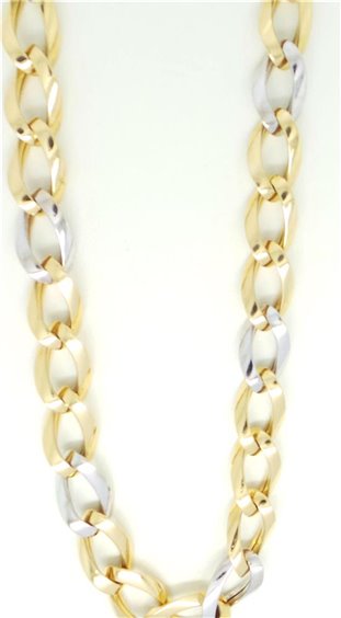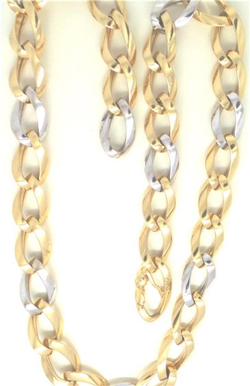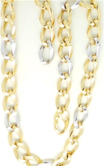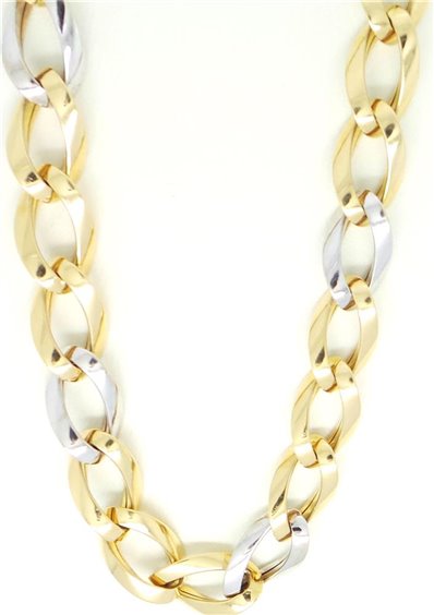 COLLIER ORO BICOLORE 18 CARATI DONNA , CATENA GROUMETTE CON TRE MAGLIE IN ORO GIALLO LUCIDO E UNA IN BIANCO LUCIDO ALTERNATE, LARGHEZZA DELLE MAGLE 10,5 MM LUNGHEZZA CM 46, CHIUSURA A FORMA DEGLI STESSI ELEMENTI DELLA MAGLIA, PESO GRAMMI 23