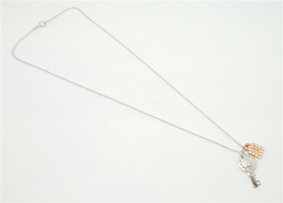 CATENA IN ORO BIANCO ROLO DI CM 40 CON PENDENTE CHIAVE PIU' LUCCHETTO MISURA LUNGHEZZA MASSIMA CM 1.5 DIAMETRO MM 10 ,LUCCHETTO IN ORO ROSSO MISURA MM 7.5 X 7.5 .TUTTO CON CERTIFICATO DI GARANZIA