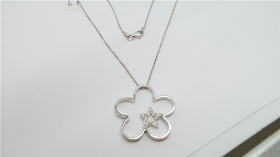collana in oro bianco lavorazione veneziana con chiusura a moschettone .pendente quadrifoglio non estraibile misura cm 2x2 massiccio e stellina con incastonati dei zirconi saldata all'interno.peso totale gr 7.5. tutto con garanzia
