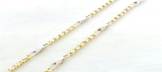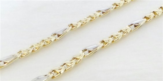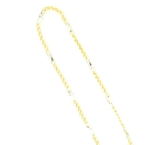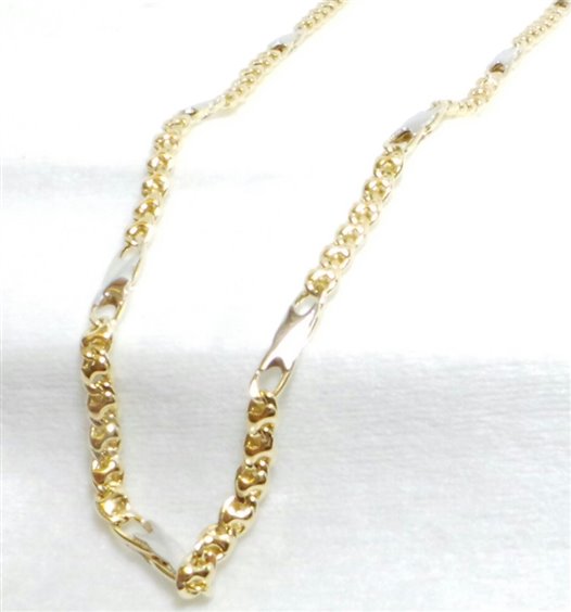 collana in oro giallo lucido con elemento alternato in oro bianco larghezza lavorazione mm 3.3 .lunghezza cm 50 chiusura con moschettone . certificato di garanzia .
