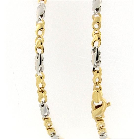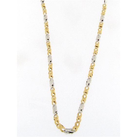catena in oro bianco e giallo piatta e piena a maglia di mm 5 larghezza. chiusura con moschettone lunghezza cm 50. certificato di garanzia