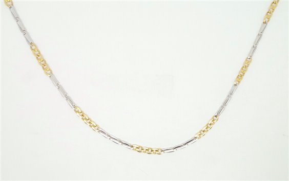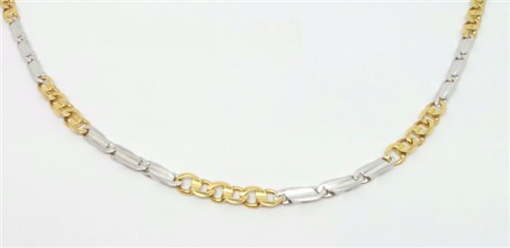 COLLANA IN ORO BICOLORE TRE ELEMENTI BIANCHI E TRE GIALLI MASSICCIA , LARGHEZZA MM 3.70 SPESSORE MM 1.4 RIFINITURE FATTE ARTIGIANALMENTE CON QUALITA' MOLTO ALTA . CHIUSURA CON MOSCHETTONE CHE RIPORTA LOGO E PUNZONE SECONDO NORMATIVE. DISPONIBILE ANCHE IL BRACCIALE