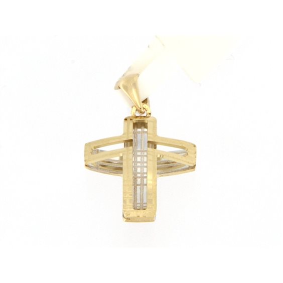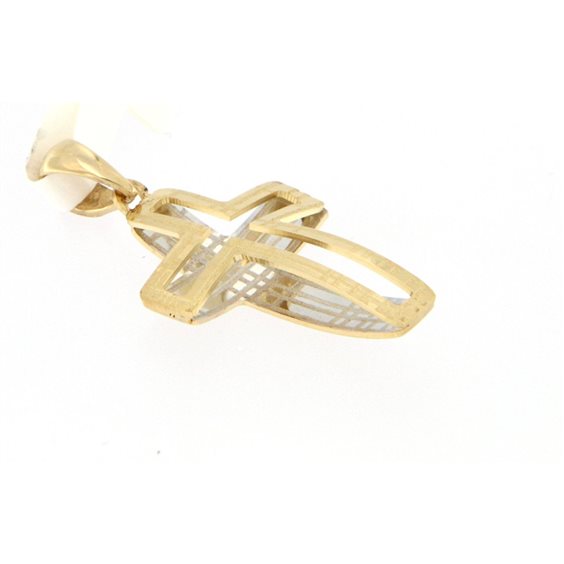 CROCE PENDENTE IN ORO GIALLO E ORO BIANCO LUCIDO VUOTA ALL'INTERNO . CERTIFICATO DI GARANZIA GRANDEZZA CM 3 X 1,5. CERTIFICATO DI GARANZIA