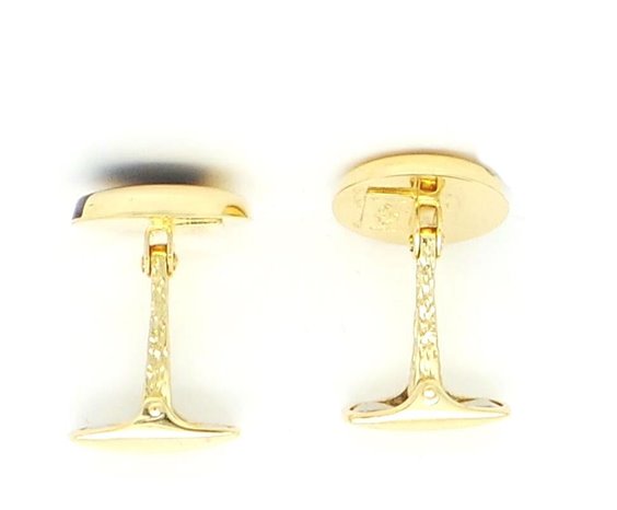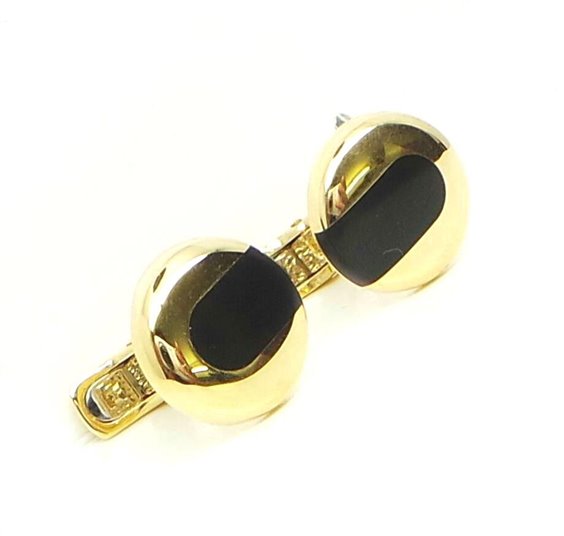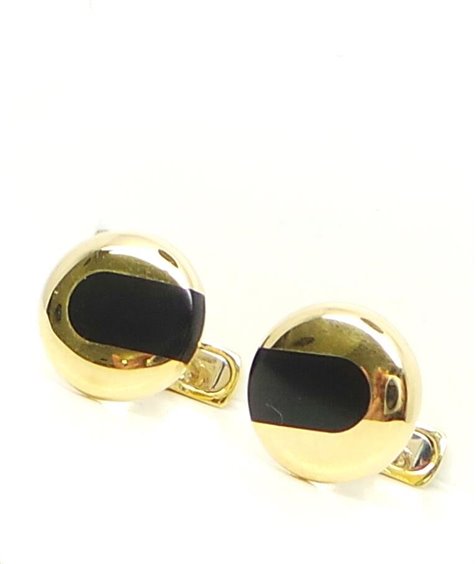 GEMELLI IN ORO GIALLO 750/°°° LAVORAZIONE LISCIA A FORMA TONDA MISURA ø 14,5 MM CON INSERTO IN PIETRA DURA ONICE. CHIUSURA ALL'AMERICANA . PESO GR 8,70. SPESSORE 3 MM.