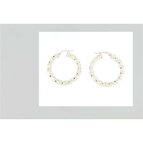 ORECCHINI A CERCHIO IN ORO BIANCO LUCIDO LAVORAZIONE A TORCHON CON CHIUSURA CON FORCELLA A SCATTINO . IL TUBICINO DI MM 3,8 DI SPESSORE è VUOTO ALL'INTERNO PER PERMETTERE LA LEGGEREZZA DELL' ORECCHINO A LOBO . IL DIAMETRO GRANDEZZA ORECCHINO è DI CM 2,5. CERTIFICATO DI GARANZIA