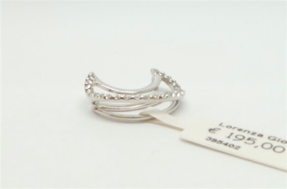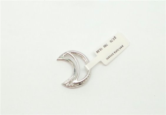 PENDENTE IN ORO BIANCO A FORMA DI MEZZA LUNA ,LAVORATA A FILO CON INCASSATI ZIRCONI NELLA PARTE FRONTALE, LA LUNGHEZZA MISURA CM 2, LARGHEZZA CM 1.5 , SPESSORE CM 0.55. LA CATENA VA PASSATA TRA LO SPESSORE .LA PANCIA E' RIIVOLTA VERSO SINISTRA VISTA DA UNA SECONDA PERSONA DURANTE L'INDOSSO. LOGO E PUNZONE SECONDO NORMATIVE .