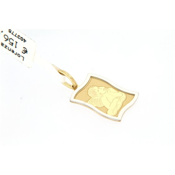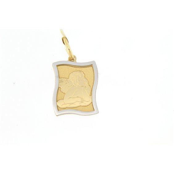PENDENTE RETTANGOLARE IN ORO GIALLO LUCIDO E SATINATO CON RAFFIGURATO IN ALTO RILIEVO L'ANGELO DI RAFFAELLO MISURA MM 19 X 13 . IL CONTORNO è IN ORO BIANCO. LA CONTROMAGLIA è SUFFICENTEMENTE GRANDE DA PASSARE LA CATENINA IN ORO. NELLA PARTE DIETRO POSSIBILITA'DI INCISIONE . CERTIFICATO DI GARANZIA