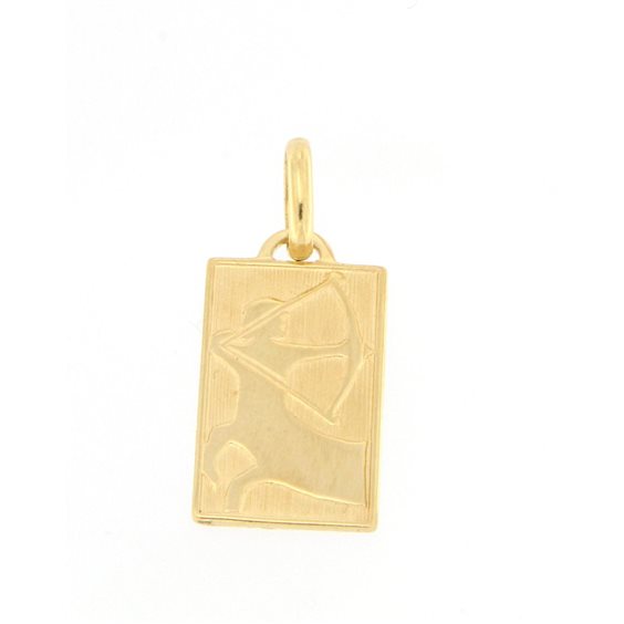 medaglia in oro giallo a lastra piena ,lucida e satinata di forma rettangolare misura cm 2 x 1 .in altorilievo si apprezza il segno zodiacale saggitario ,nel retro possibilita' di incisione .regolare punzonatura per normativa e certificato di garanzia