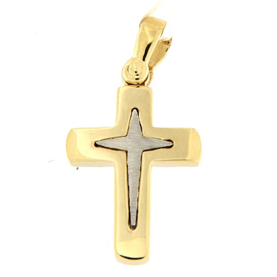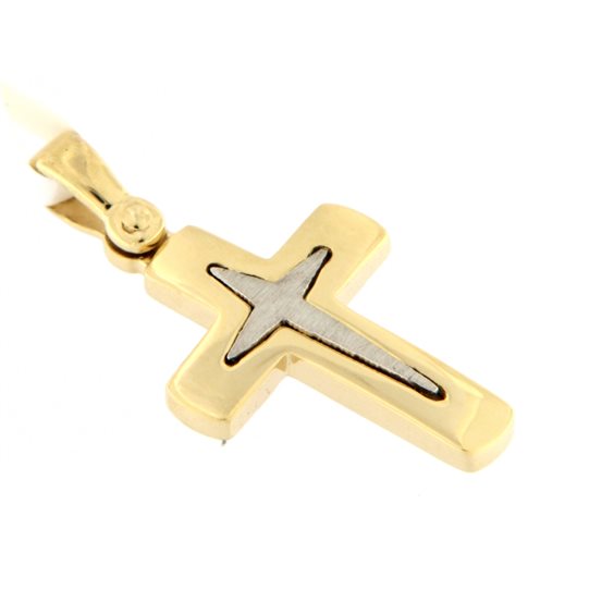 PENDENTE A CROCE MASSICCIA IN ORO BICOLORE LUNGHEZZA CM 3 LARGHEZZA BRACCIA CM 1,5. SPESSORE MM 2,5. CERTIFICATO DI GARANZIA