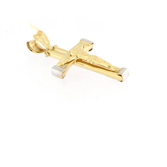 PENDENTE CROCE IN ORO MASSICCIA BICOLORE CON FIGURA SACRA LUNGHEZZA CM 3,5 LARGHEZZA BRACCIA CM 2.SPESSORE MM 4,5 CERTIFICATO DI GARANZIA