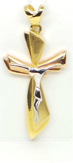 PENDENTE A CROCE IN ORO 750/°°° CON 3 COLORI , LA FIGURA SACRA è IN ORO BIANCO MISURA TOT CM 5,5 X 2,5 . PESO GR 10. LA CONTROMAGLIA DOVE PASSA LA CATENA HA UN Nø DI MM 6.