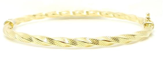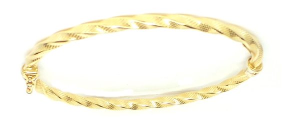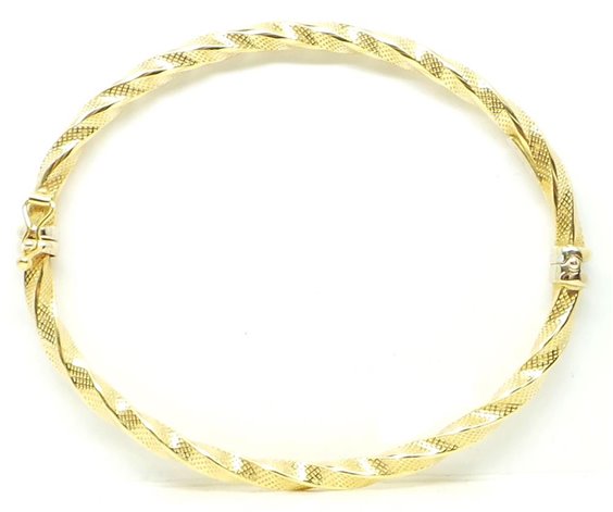 BRACCIALE IN ORO 750/°°° RIGIDO GIALLO SATINATO ZIGRINATO A TORCHON, LO SPESSORE DI DIAMETRO 3,9 . LA LARGHEZZA DI CM 6,5 , APERTURA PER INSERIRLO SUL POLSO A LATO CON SICUREZZA , CERNIERA DAL LATO OPPOSTO . PESO GR 7.