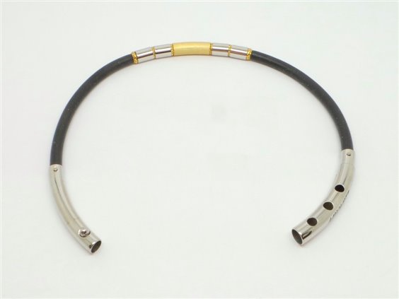 BRACCIALE IN SILICONE A FORMA CIRCOLARE DI DIAMETRO MM 3.5 NERO CON TUBICINI PASSANTI IN ORO GR 1.30 750% SATINATO E ARGENTO . CHIUSURA IN ARGENTO REGOLABILE PER UN POLSO CHE MISURA DA CM 21 A 19 . PUNZONE E LOGO INCISO INTERNAMENTE. TUTTO CON CERTIFICATO DI AUTENTICITA'.